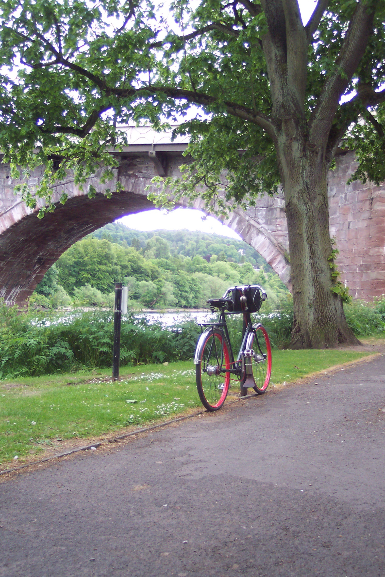 I turned downhill and headed into town, visiting a plant shop at Pauline’s request, then off along the Lade, an 800-year-old man-made stream that diverts water from the Almond (a tributary of the Tay) through Perth, originally to provide power for watermills. Now it provides some very pleasant walking or cycling through the town.
