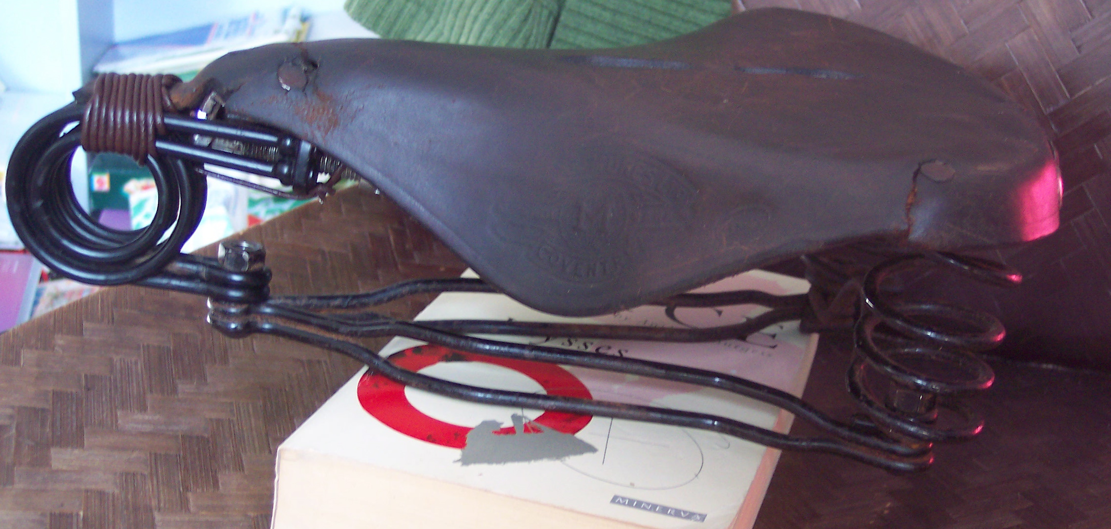 Anyway, with the building of the Dream Roadster, the question of a suitable saddle soon came up. My beau ideal is the Brooks B90/3 (my daughter and I have two of the last ever made) though I have a soft spot for the B66, but I don’t like grained leather and I prefer keyhole slots. As it happened, I had a never-used B90/3 front spring and frame attachment (much like this, if not identical) plus various odds and ends of old saddles, including a nice Middlemores cover, long since detached from its other components: