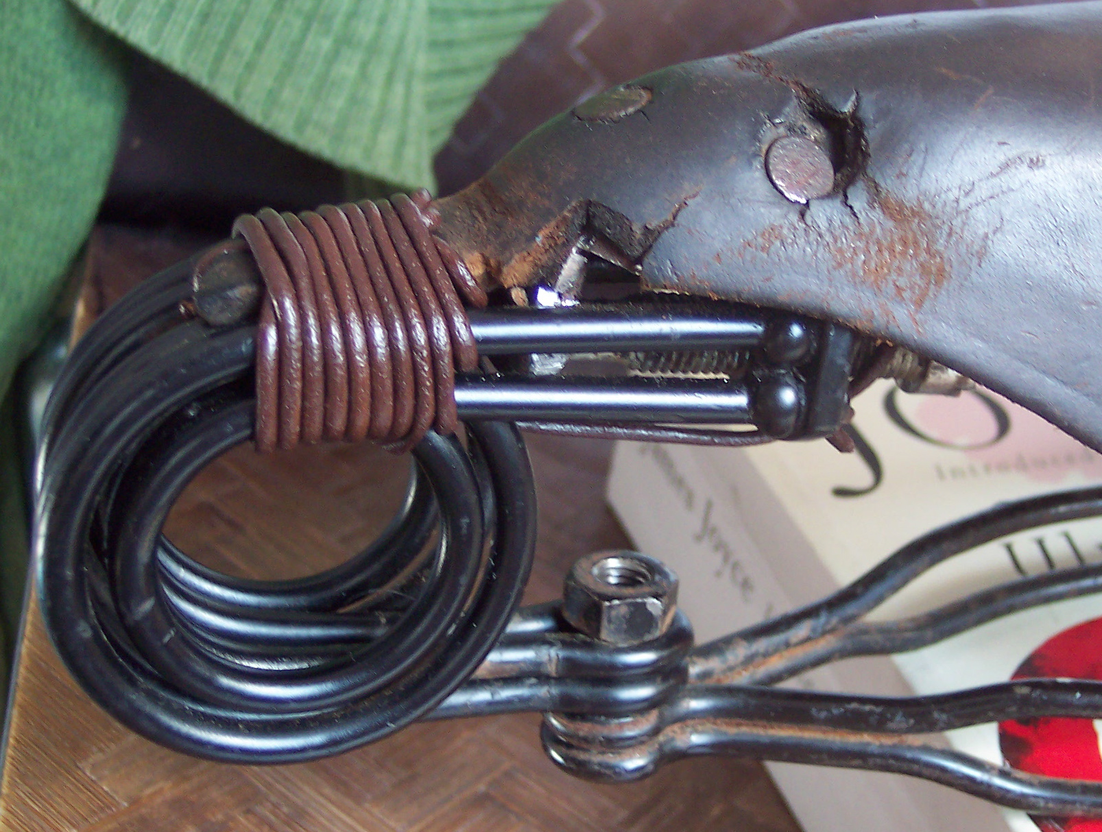 The original Middlemores saddle had a conventional coil spring at the front (much like a Brooks B73) so that the nose projected beyond it, and was covered with a rather pretty extension to the cover, like a little leather trunk that curled down and round it. This was too wide to fit in the slot in the Brooks spring, and rather than cut it off, I thought to make a feature of it by whipping it to the spring with a spare bit of leather lace.