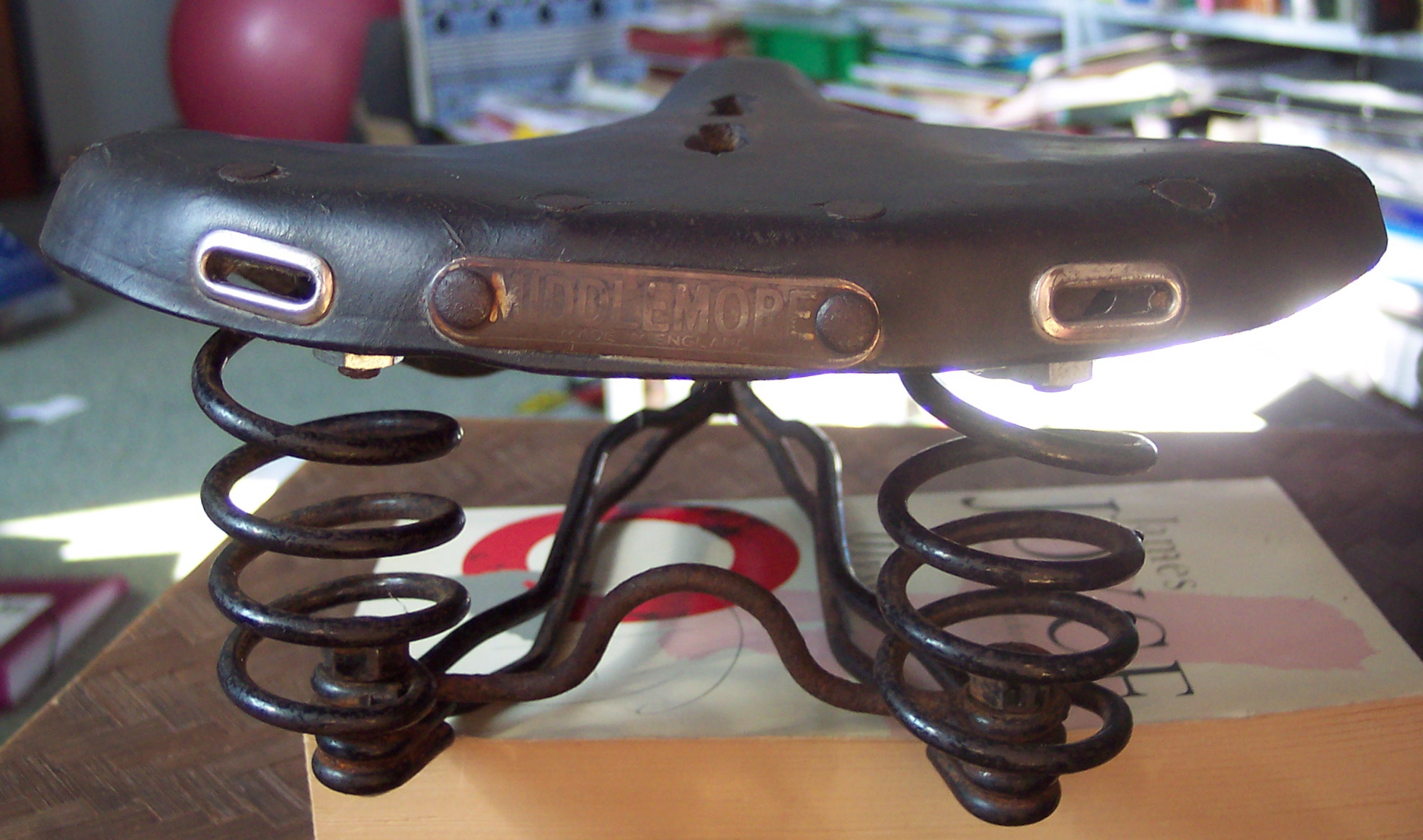 from rear 3/4 it looked rather well… I had fitted the Middlemores nose-piece into the narrow gap in the Brooks spring by dint of some judicious hacksaw-work, filing, and hacking off bits of leather – a first-class bodge, in other words.