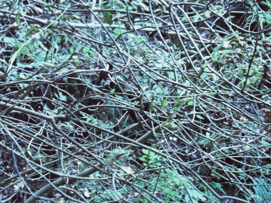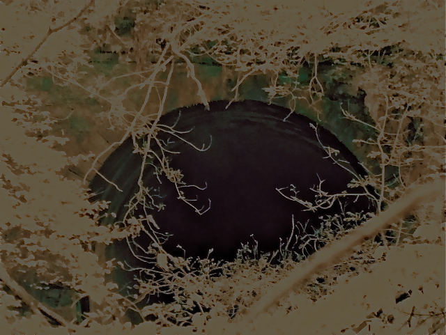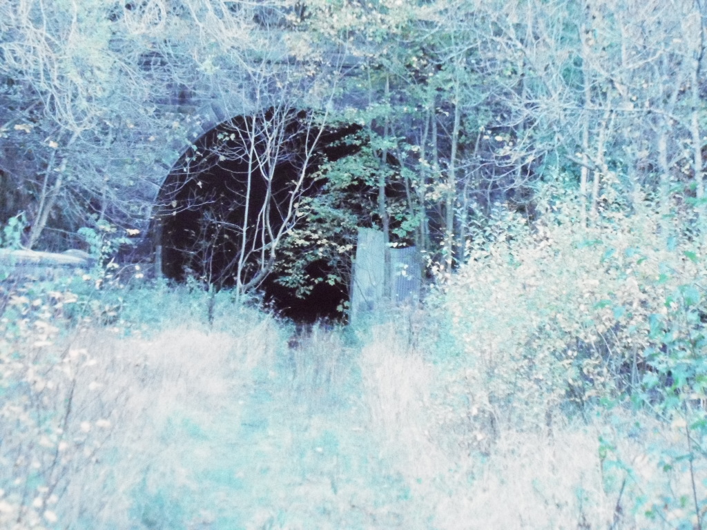 I saw that there was an alternative route off to the left and hoping to avoid the gate I took it, only to find I had miscalculated somewhat – to my surprise, instead of rejoining the road a little further up the hill than I left it, I found myself swinging right and passing under a substantial bridge that I had not realised was there; yet I must in fact have crossed it. The reason for it was clearly the stream that I was now cycling alongside, with the road I wanted on the farther side. However, I was not too perturbed, reasoning that a well-made track must lead somewhere, and it was heading in the right general direction. A little way on I came on some substantial but derelict farm buildings, which had the haunting quality all such buildings have, enhanced in the picture by the weird colour setting, which nonetheless captures the atmosphere surprisingly well