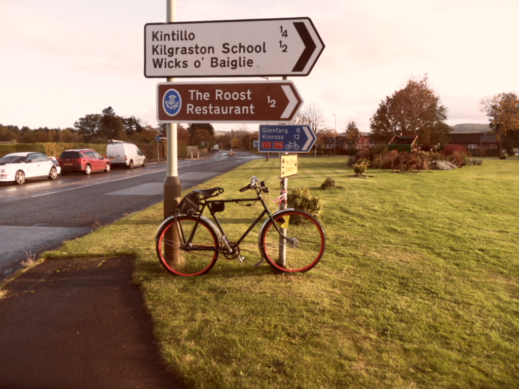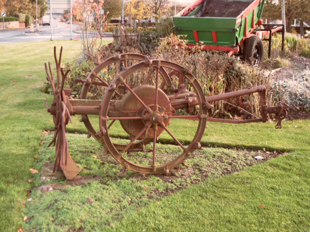 In Bridge of Earn I paused to take some pictures, first of a signpost, then of a curious agricultural implement on display near by.