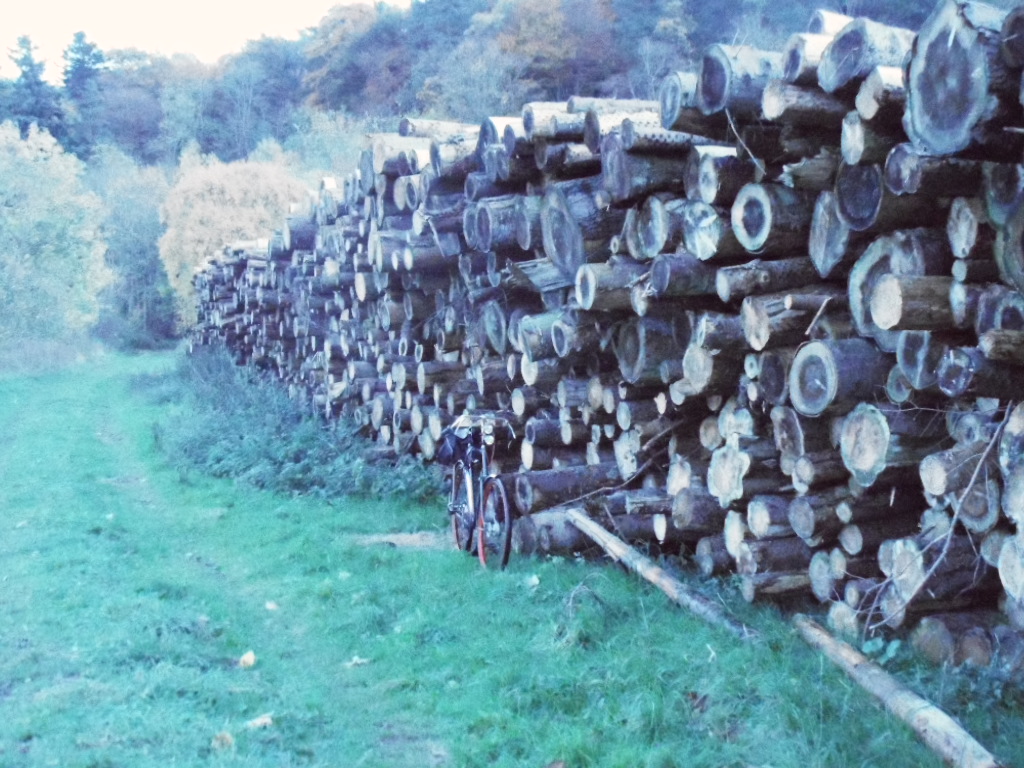 I cycled on through pleasant Autumn woodland, past a great stack of felled timber
