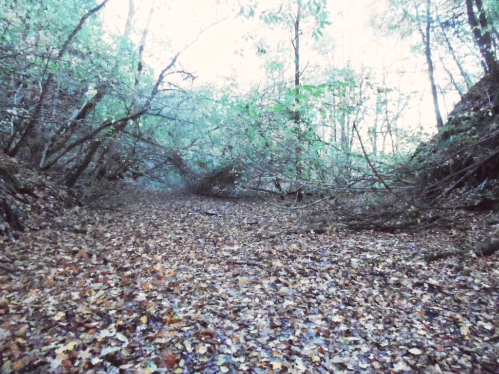 I emerged from the North tunnel onto a pleasant stretch of overgrown trackbed running between autumn woods, but it was very muddy underwheel and for some distance was in fact the bed of a stream; but this is the kind of thing that imperial roadsters take in their stride. I would not attempt it on a narrow-tyred mount. After some distance I came on a conundrum: the main path rose steeply to the right, with a more overgrown fork descending to the left.