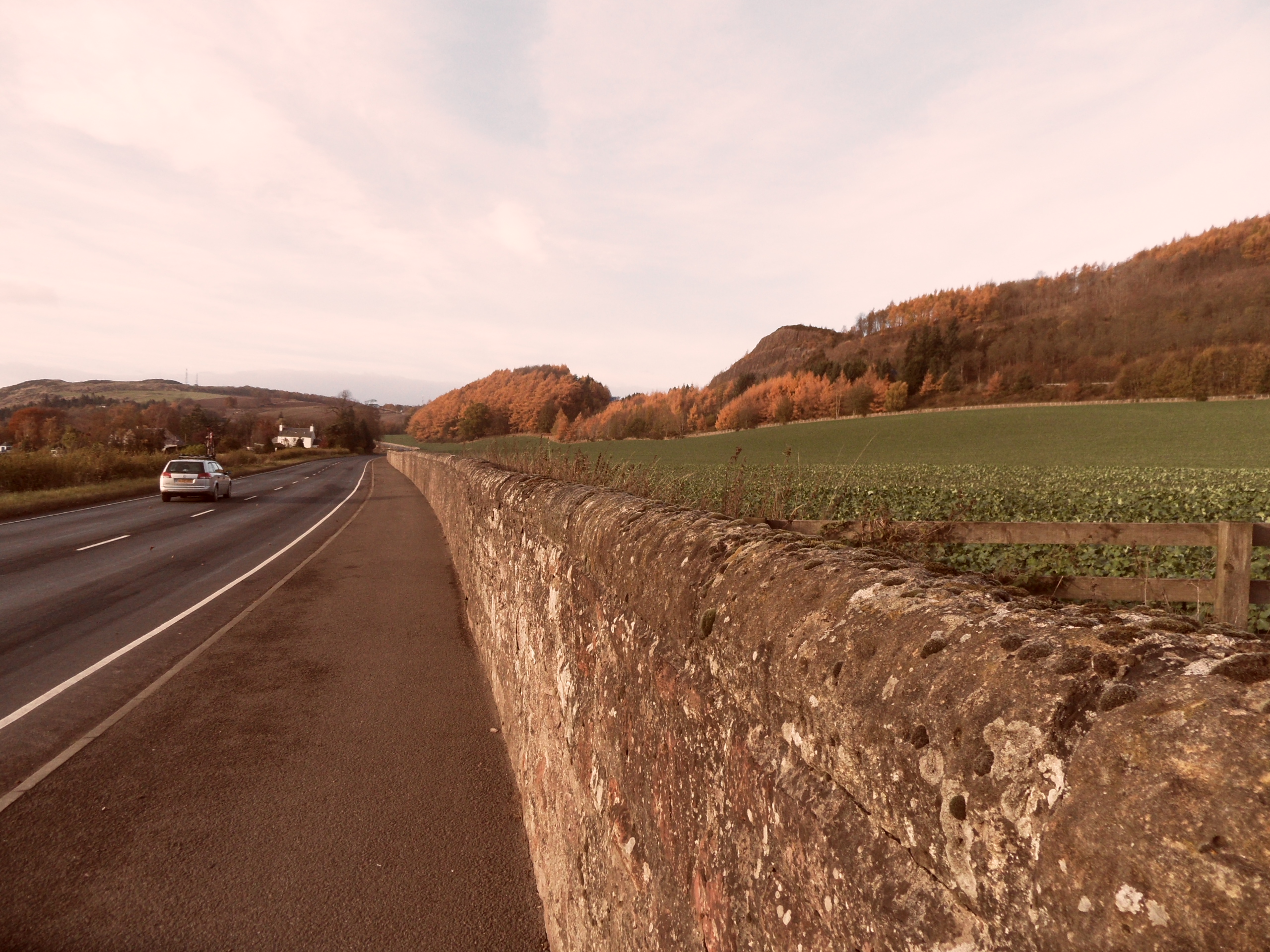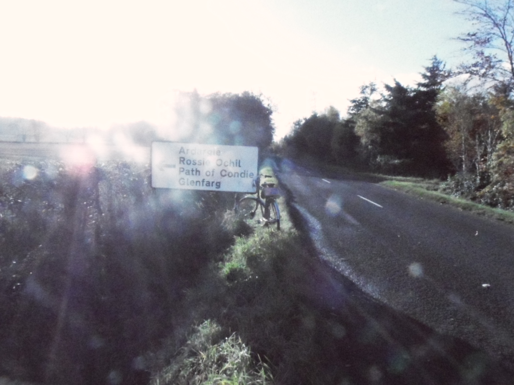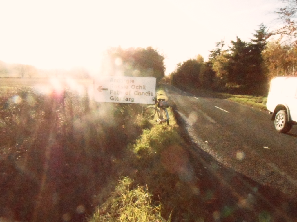 The answer to the second question was ‘nowhere in particular’ : I had resolved to investigate the road in the direction of Longforgan and Forteviot, partly as a scouting mission for some future attempt on the Ochil glens, though I did not think I would attempt the first opportunity for that, over the Path of Condie, which is steep and twisting.