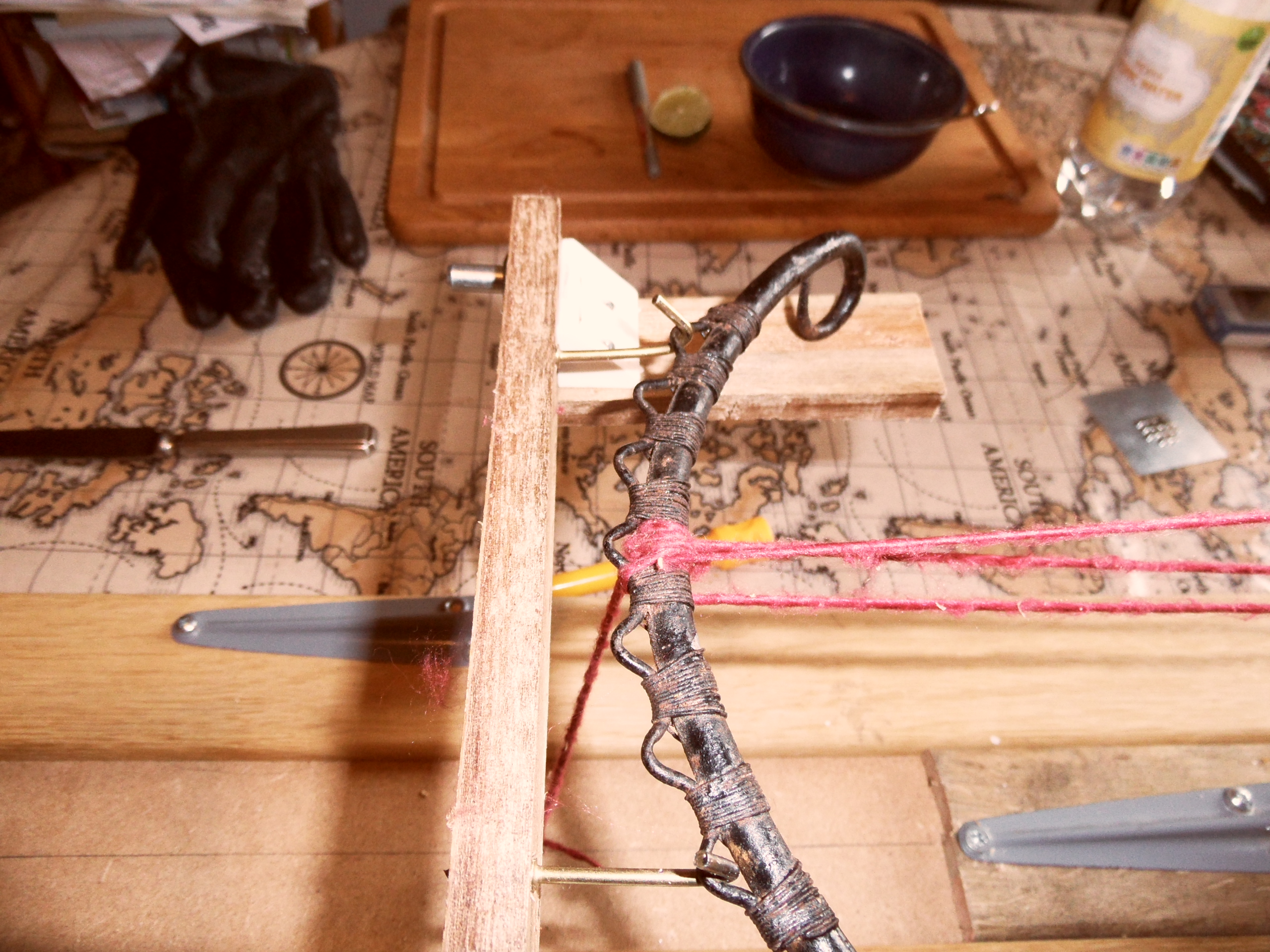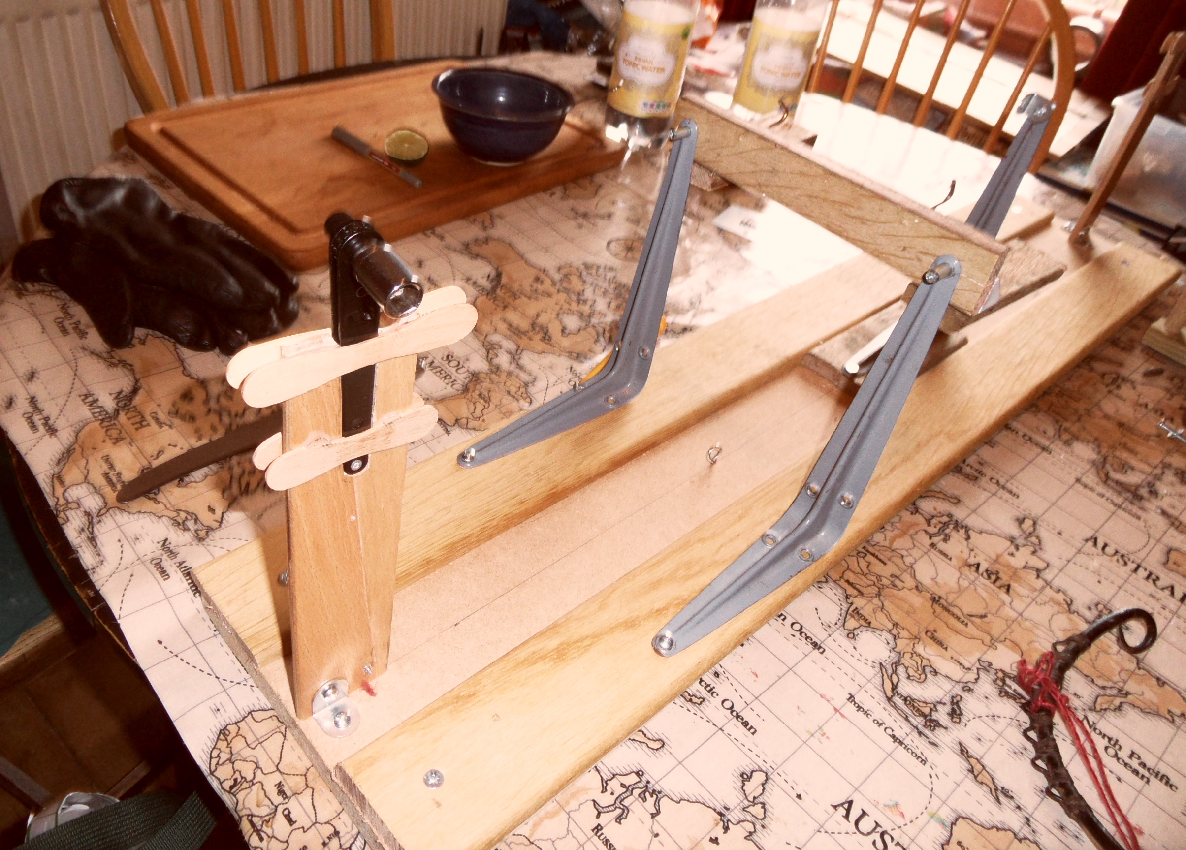 The arrangement was very much a makeshift – (a timenoguy, indeed, Susanna!) and the ratchet drive was actually bound to the top of the post with the discarded brass wire from earlier, which later had to be supplemented with string, as the strain of operation began to tell on the glue that held the lolly-sticks. By that time I was determined to finish the thing, come hell or high water, and it has to be said the contraption finished in a fairly ramshackle state of fallingapartness. If (when!) I redesign it, I think I will retain my beloved ratchet drives, but incorporate them in the winder-hubs and put the socket on top of the pillars.