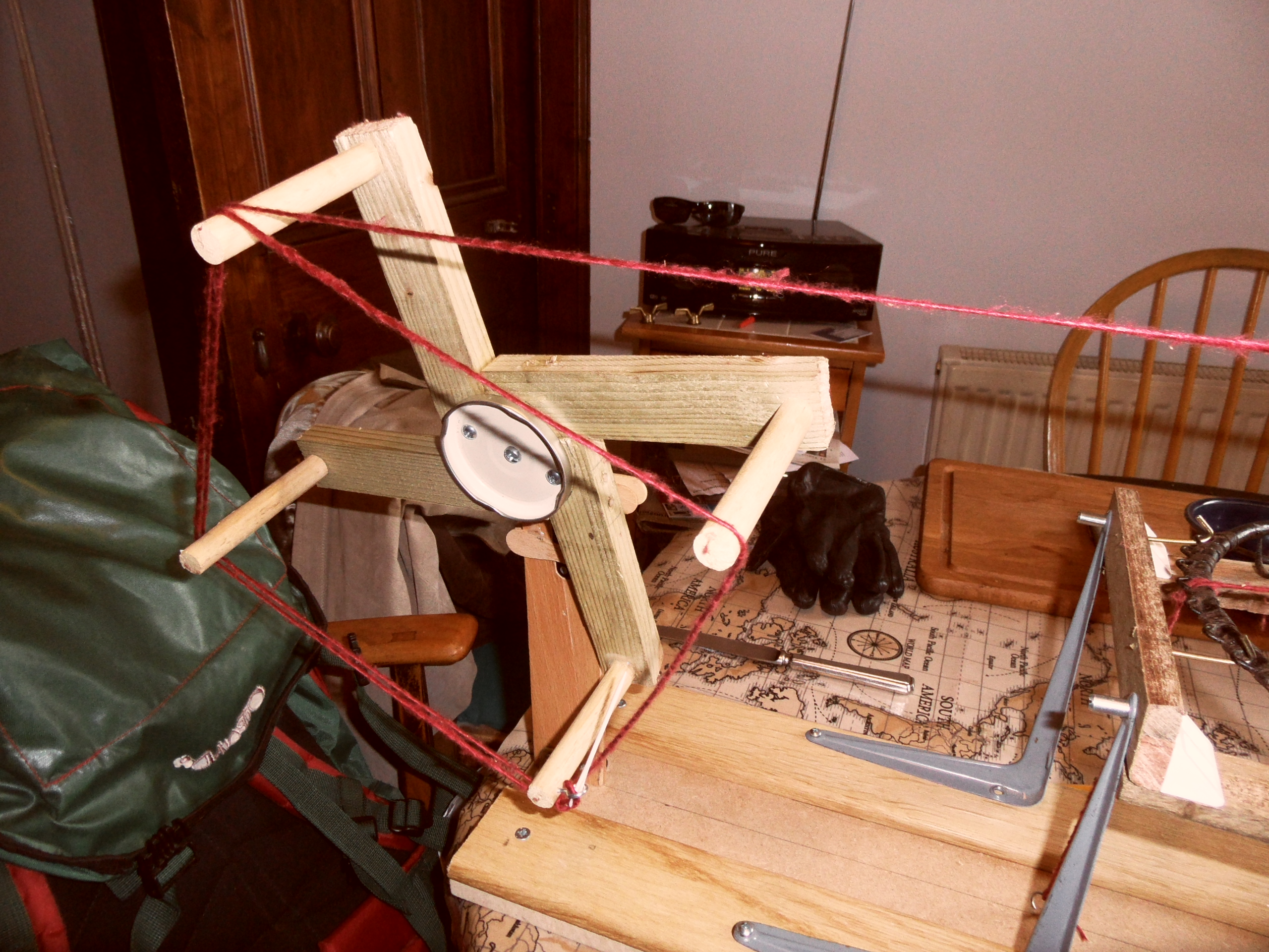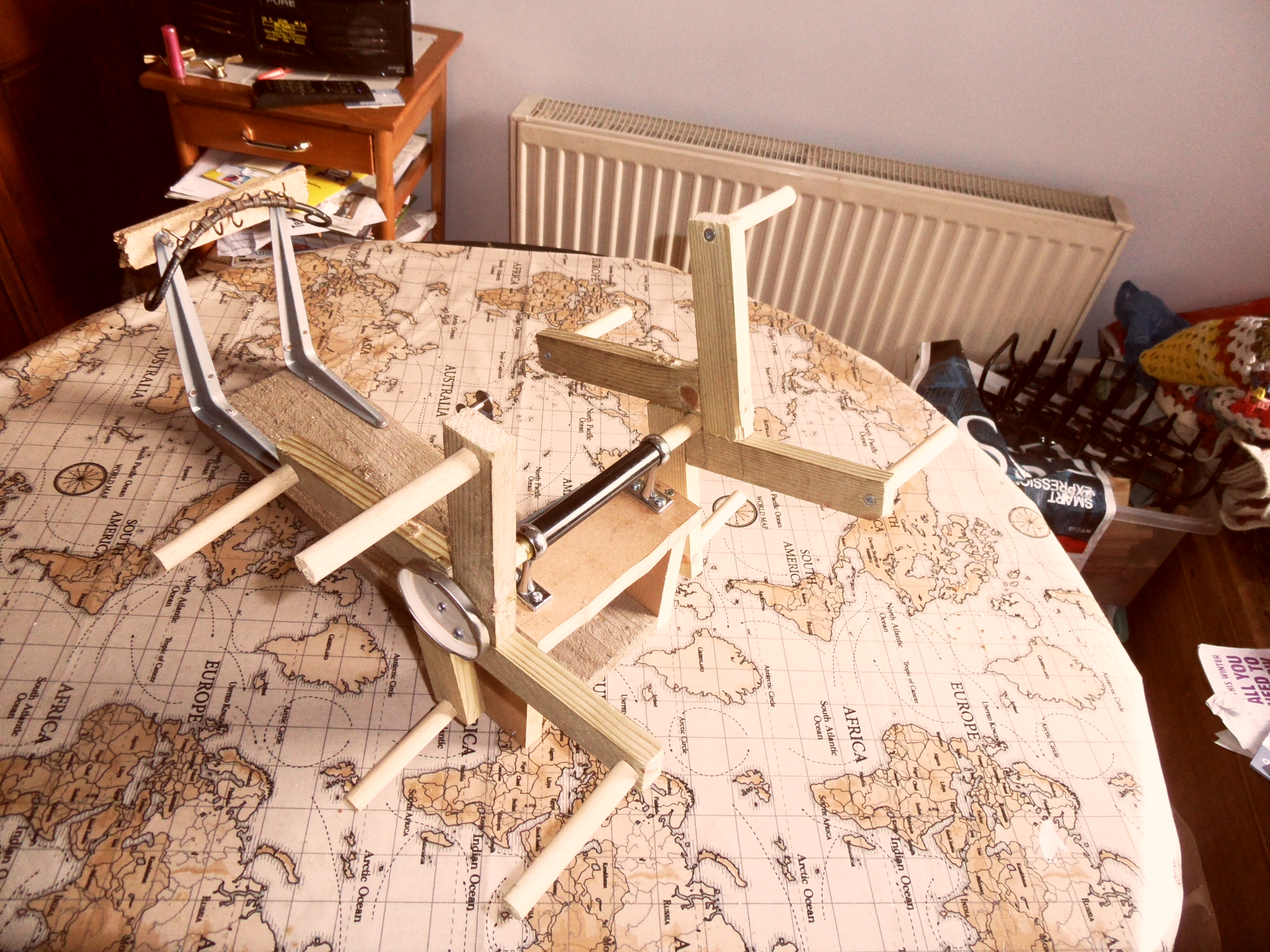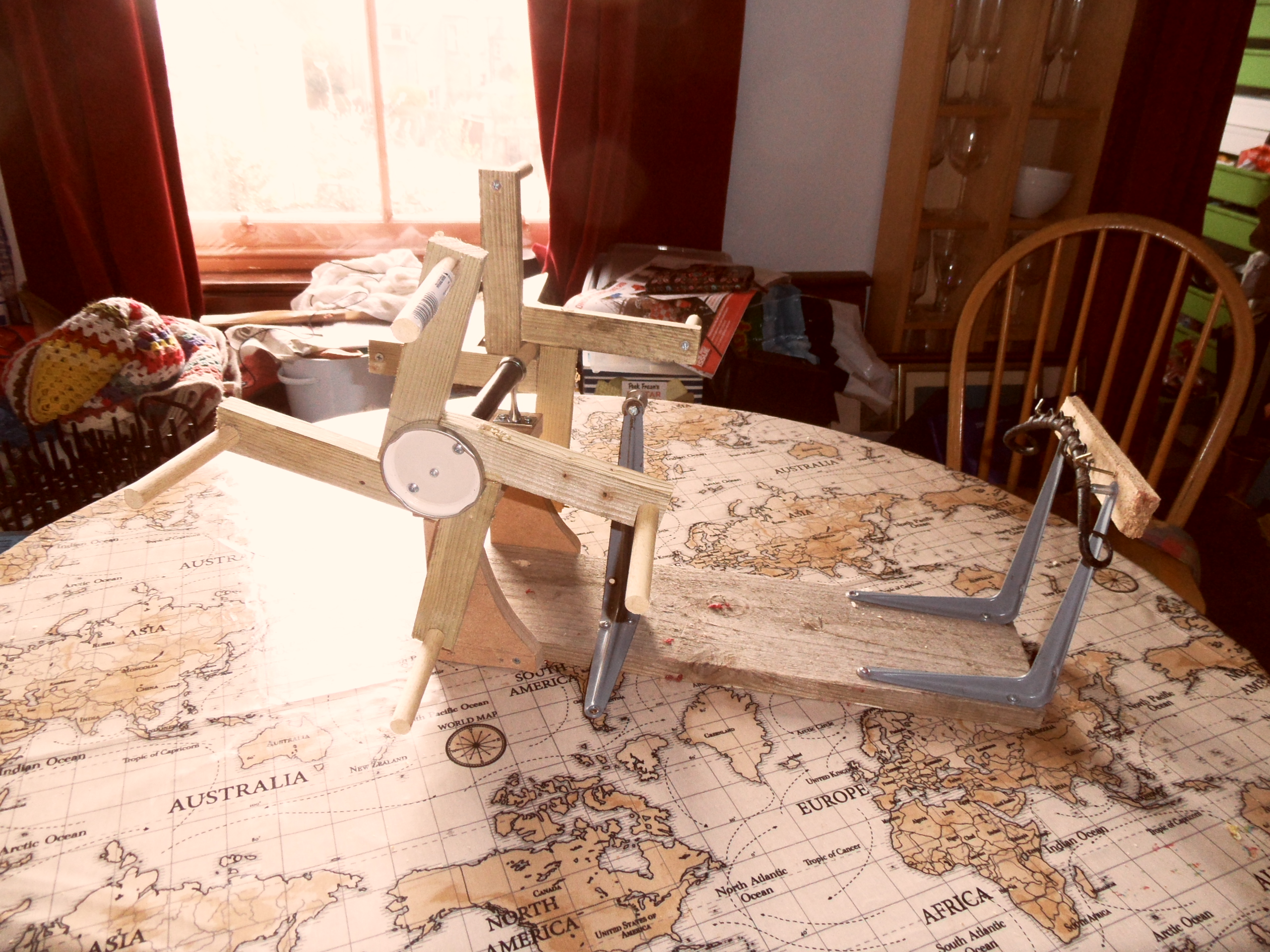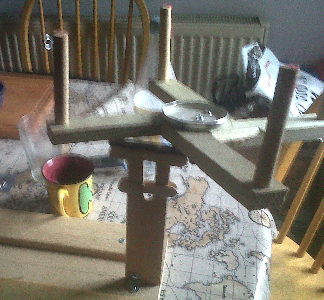 The seed that Susanna Ingram kindly planted in our conversation about yarn winders took some time to germinate, but with the onset of Spring and the stirring of the blood, I decided I really should get round to doing something. So I built a contraption.