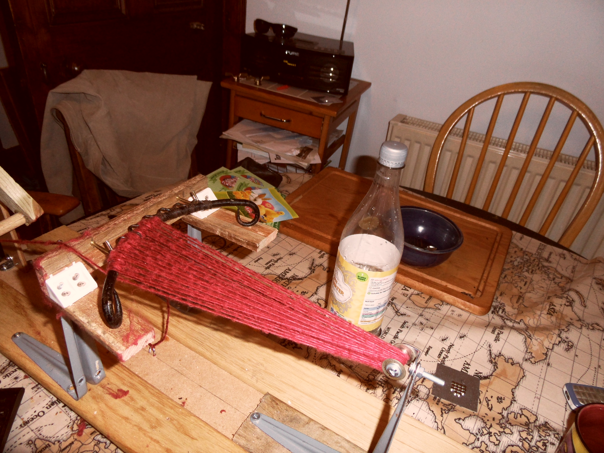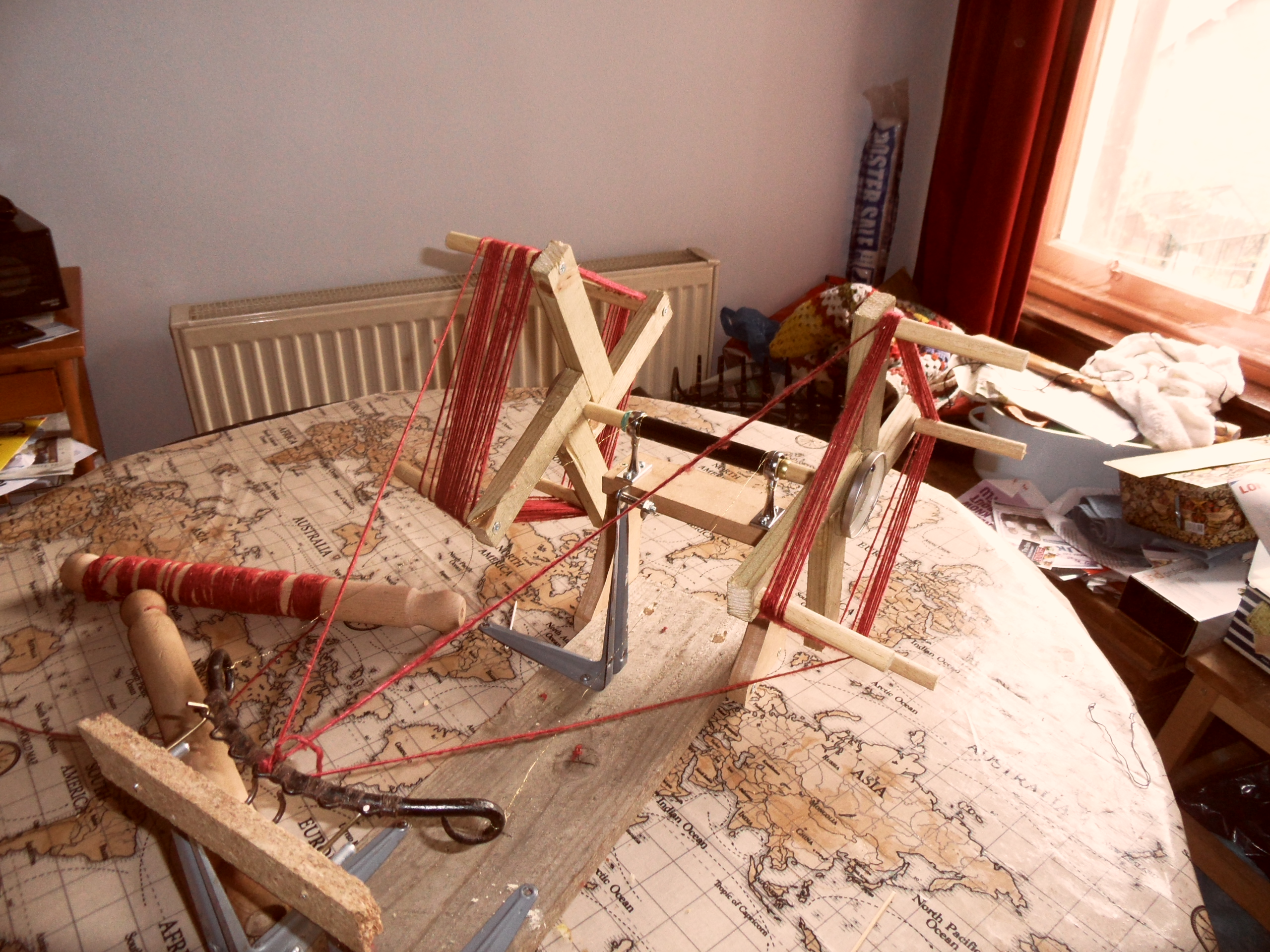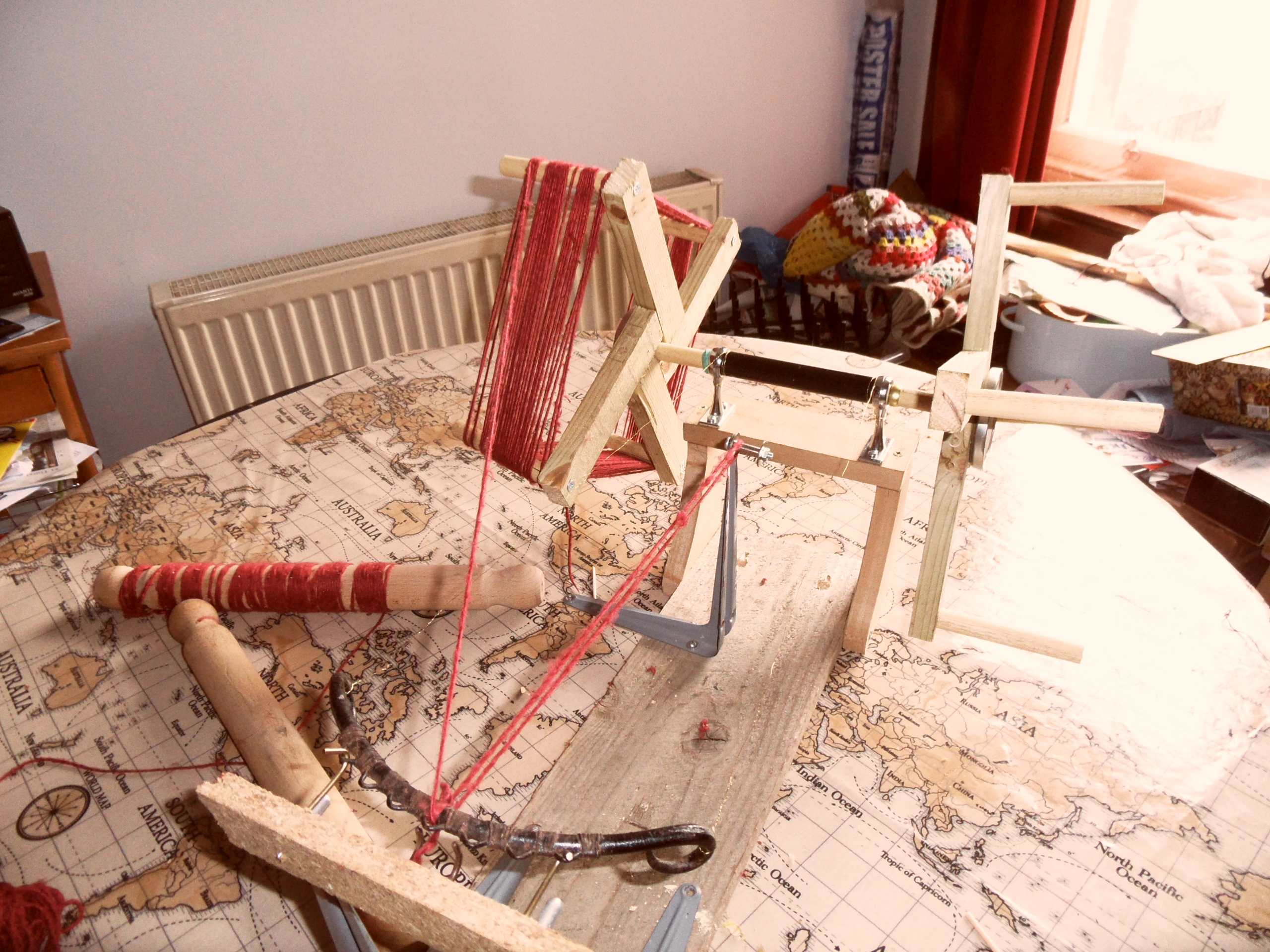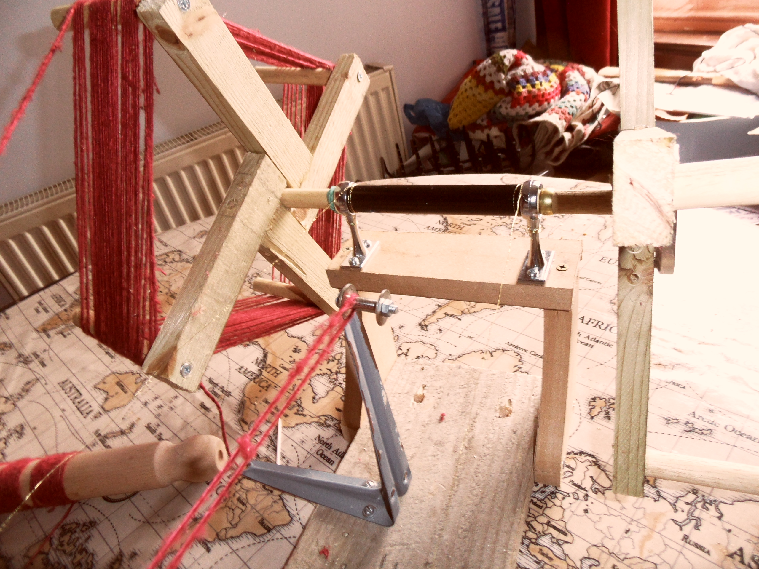The seed that Susanna Ingram kindly planted in our conversation about yarn winders took some time to germinate, but with the onset of Spring and the stirring of the blood, I decided I really should get round to doing something. So I built a contraption.