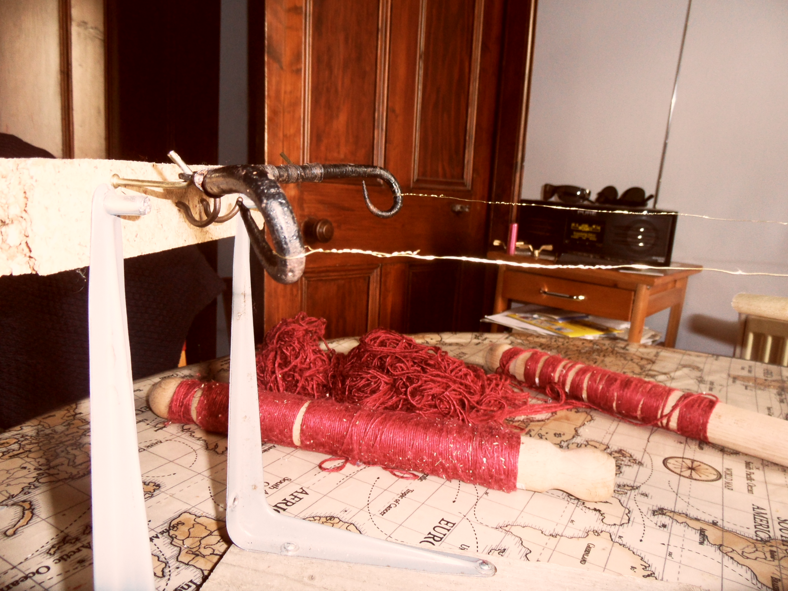 Just how laborious the task is, even with yarn winders, can be seen from the pictures below. In the first, the two threads in the foreground are the first and second warps – the upper one will eventually run over the top of the nose-bobbin – seen in the middle of the picture, at the top of the grey bracket – while the lower one will run back from the bobbin to the cantle; but in the meantime, the thread is divided between the two winders: the line in the top left corner has already passed round the cantle and through the loop, and is being wound onto the left-hand-winder; the thread that is, effectively, the slack between warp 1 and warp 2 is wound on the right hand winder; the second picture gives the overall view: