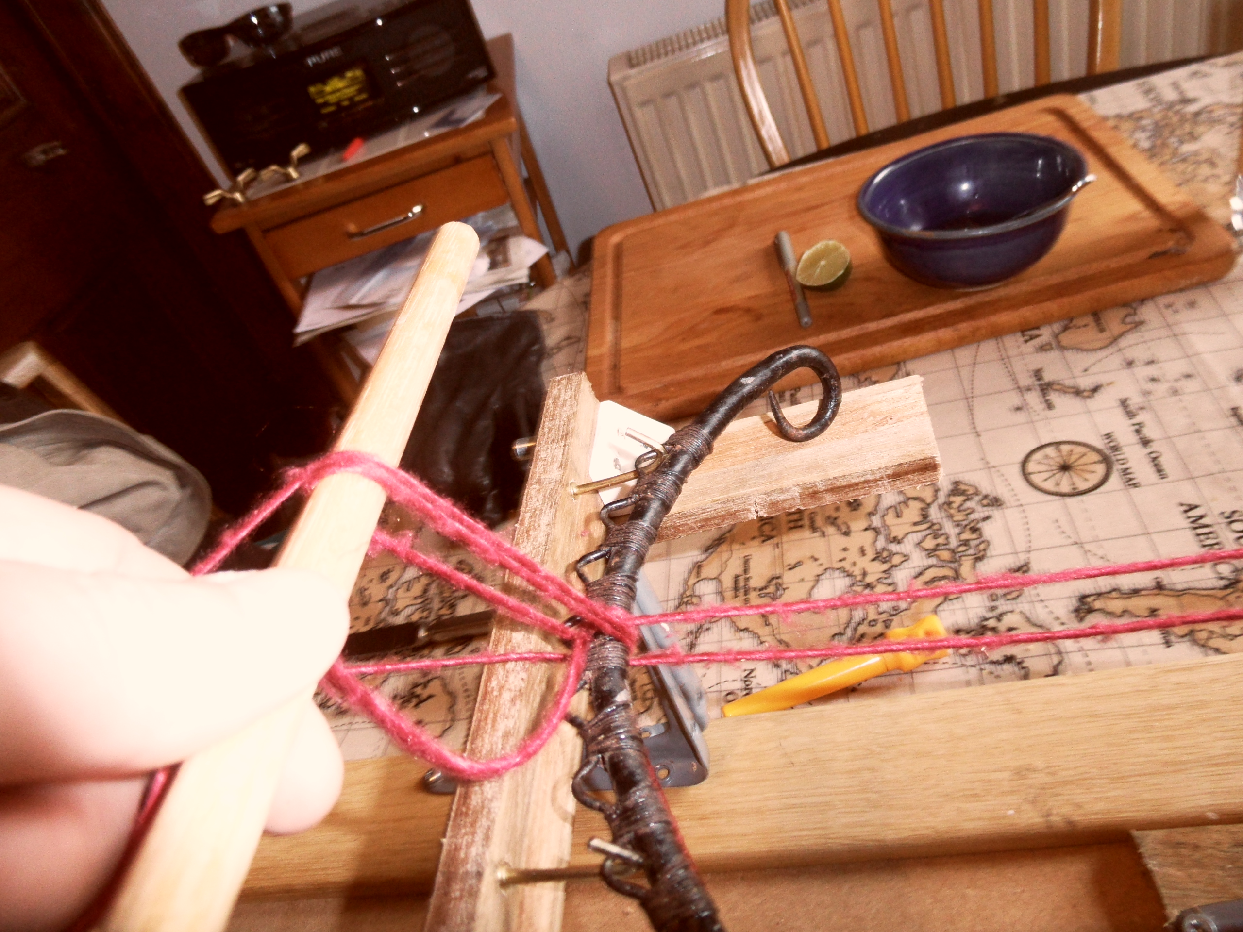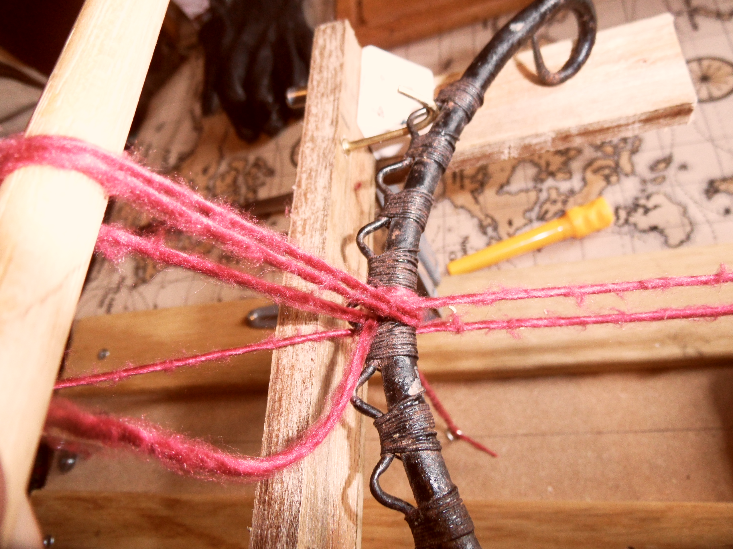 Each fresh cycle starts with a double turn about the cantle-iron, but it is important to see that as a separate action, nothing to do with the winders and requiring a separate tool to facilitate it; what I hit upon was the simple expedient of a rod – another length of dowel – which would double the cantle-iron for most of the passage of the forward warp, which would begin by being wrapped around the cantle and the dowel; only at the very end, when all the slack had been transferred to the forward winder and the warp was to be drawn tight, would the rod be slipped out and the thread left to tighten about the cantle iron.