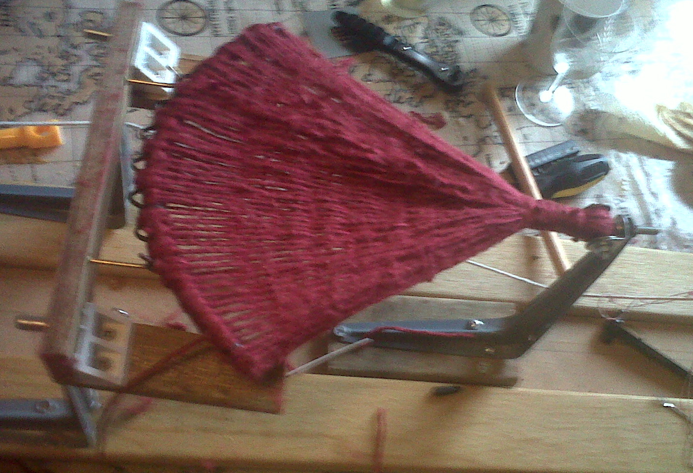 This is the first version, though strictly speaking, it is Mk II, since it incorporates the jig I used previously. It has, I would allow, more than a touch of the Heath-Robinson about it: note the use of jam-jar lids, a brass olive and quantities of dowelling rod; though what appears to be a toilet-roll holder is actually two towel-rail supports and a bit metal tube sawn from a left-over part of our spiral staircase. The advantage it offers is that the yarn winders, with pegs placed (more by luck than calculation, I confess) at 9″ centres, will take a yard of silk at every turn.The winders, by the way, though connected by a common axle, rotate independently.