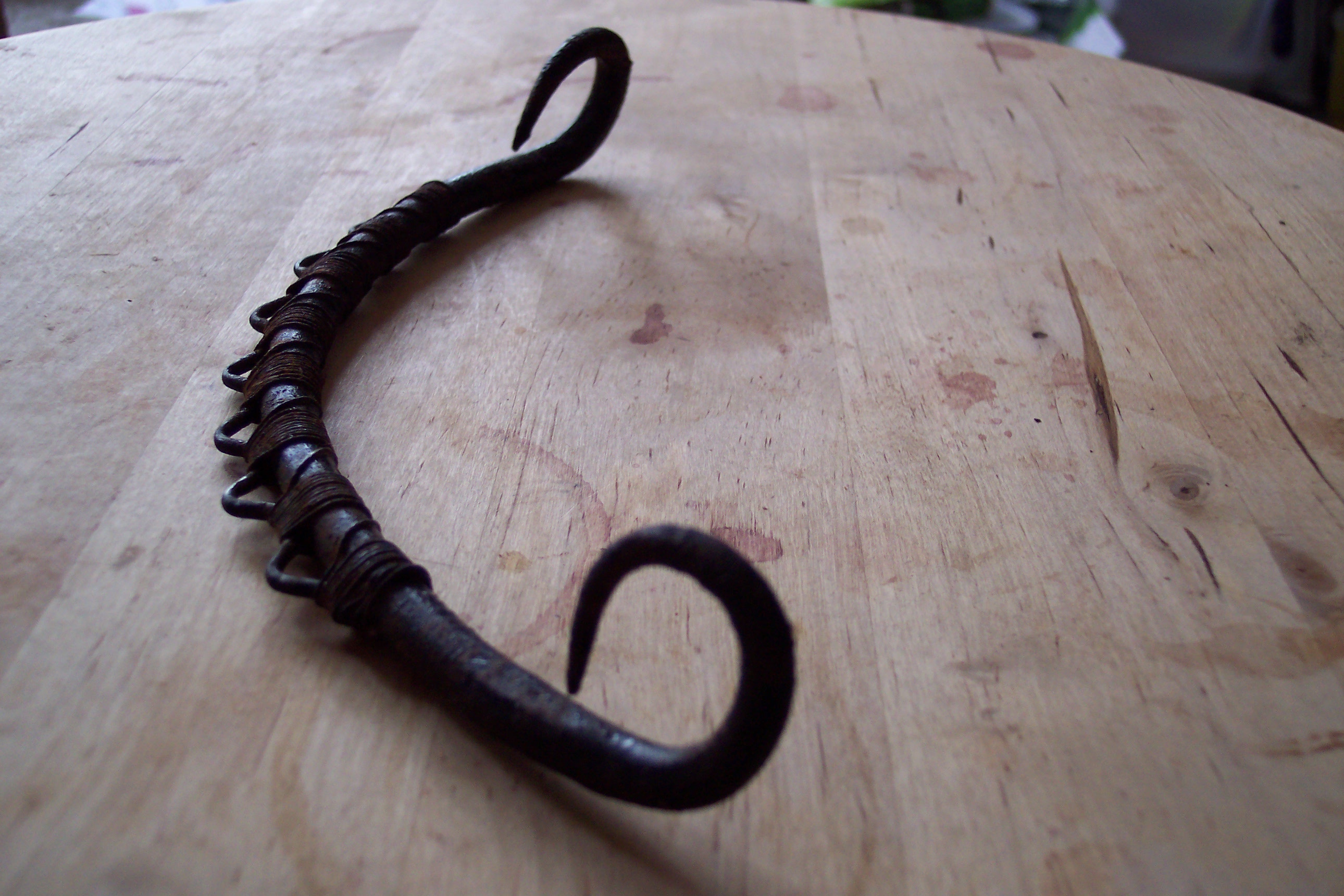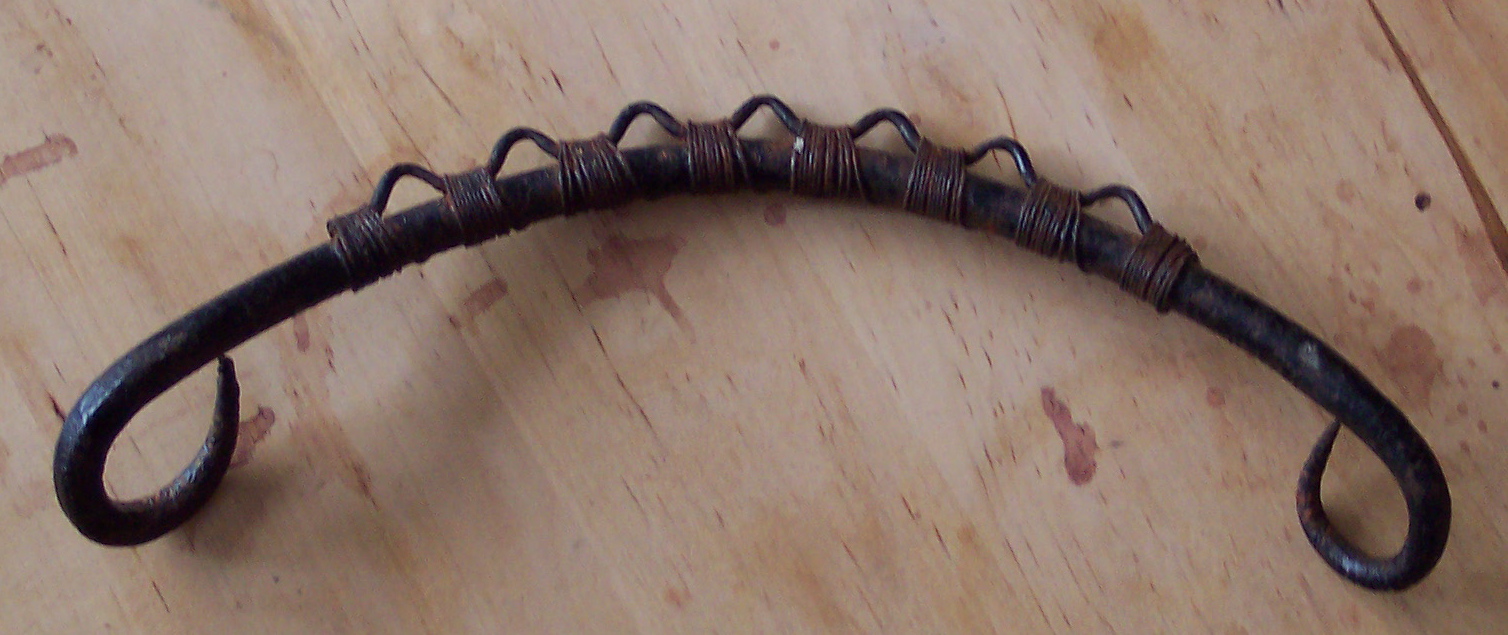 It looks well enough, in a sinister way – a bit like the iron crown of Morgoth from the Silmarillion – complete with seven loops which might be stone settings but actually provide an attachment for the seven springs from which the rear of the saddle is suspended. There are two methods Sue Hodghton suggests for weaving: the one I chose starts with the tip of one of the horns and winds the cord around the cantle-iron until the first quarter of the ‘hook’ is covered, and you have reached the lowest point; then you run the cord up to the bobbin that secures the nose of the saddle, pass it round that, returning to the cantle to form the first pair of warp threads; you take a single turn about the cantle, then go back round the bobbin to form the next two warps and so on.