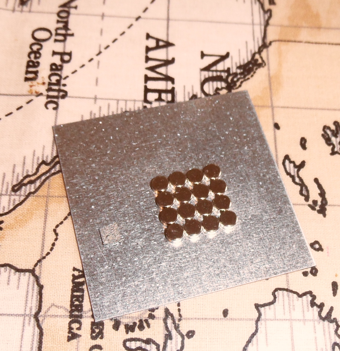 I might have been better to stick to my original plan of two larger disc magnets fitted neatly into the 10mm sockets, but I allowed the man in Maplin’s to seduce me into buying a pack of twelve mini magnets (because of course you never know when you might need one, and they cost the same). These were actually packaged as a scientific toy, which provided some diversion when I got home – below you can see a small square of graphite: in the first picture, it is resting on the left of the metal plate, beside the array of mini-magnets; in the second, it appears to be resting on the bed of magnets, but is actually hovering above them, the same principle that operates a mag-lev train. How cool is that? – well, I thought it was, a bit: