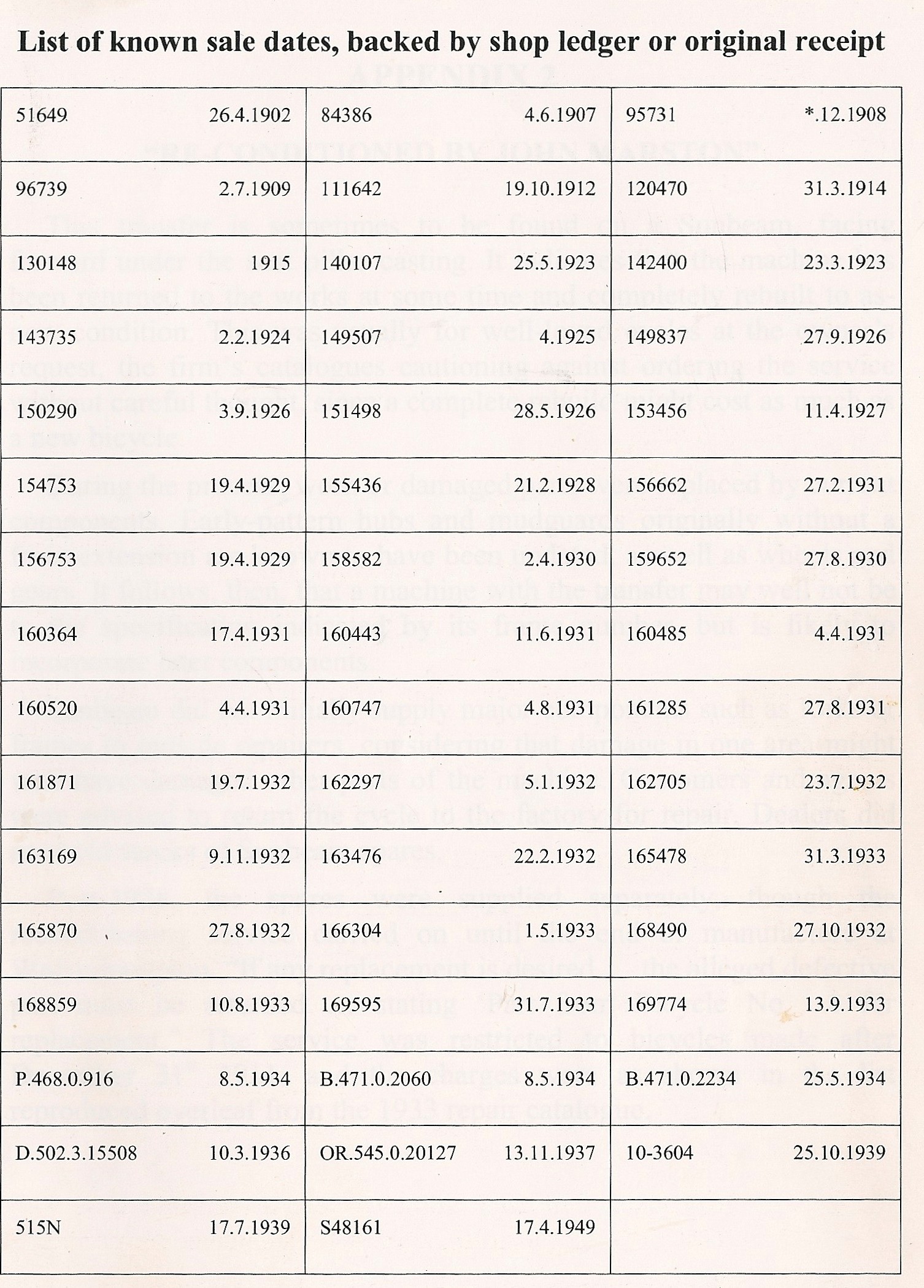 The evaluation report told me the frame number was 71695 (a five-figure frame number in itself is enough to give a Sunbeam enthusiast palpitations) and this one lay somewhere between 1903 (when the two-speed gear was first offered in the catalogue) and 4.6.1907 to which 84386 has been dated. With 51649 being 26.4.1902, a quick bit of rough and ready arithmetic suggests a monthly production over that period of 536.5 units giving lot 454 a date somewhere around July 1905 (the same sort of calculation puts 129403 – lot 299 – somewhere about September 1915*).