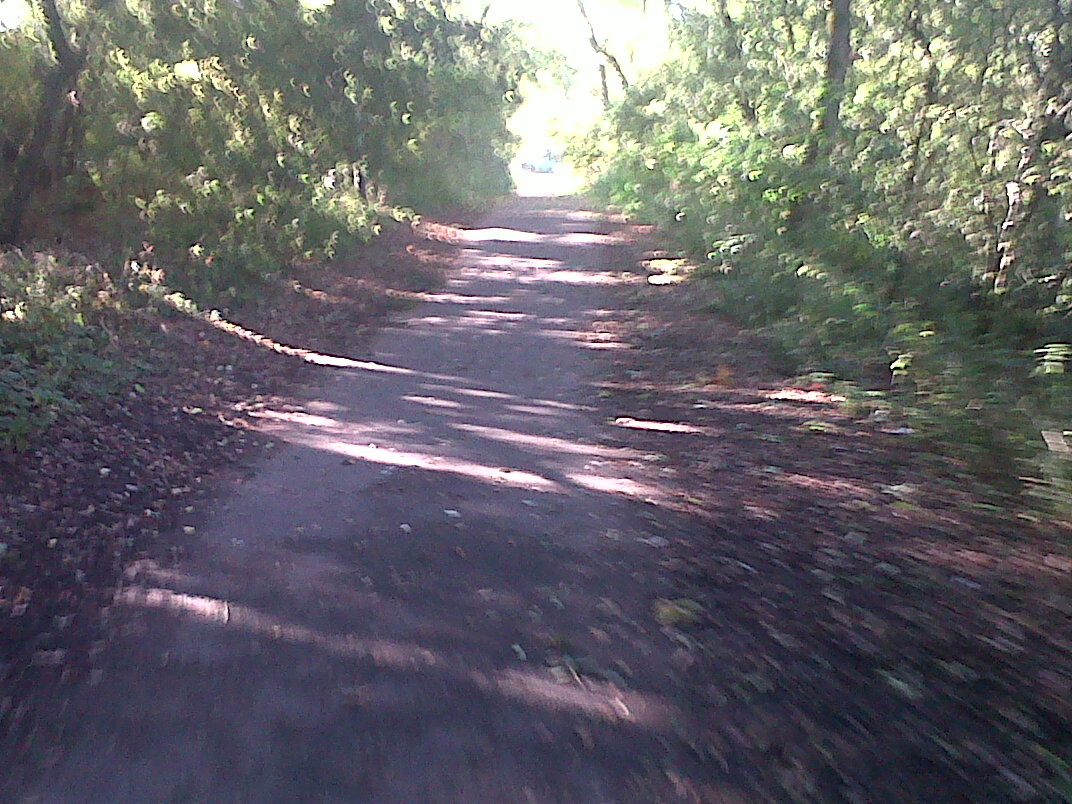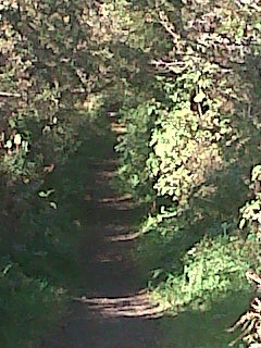after a little way travelling westward along the track of Old Gallows Road, we turn North towards the vale of the Almond, a steady descent by narrow paths overhung with trees and bushes: