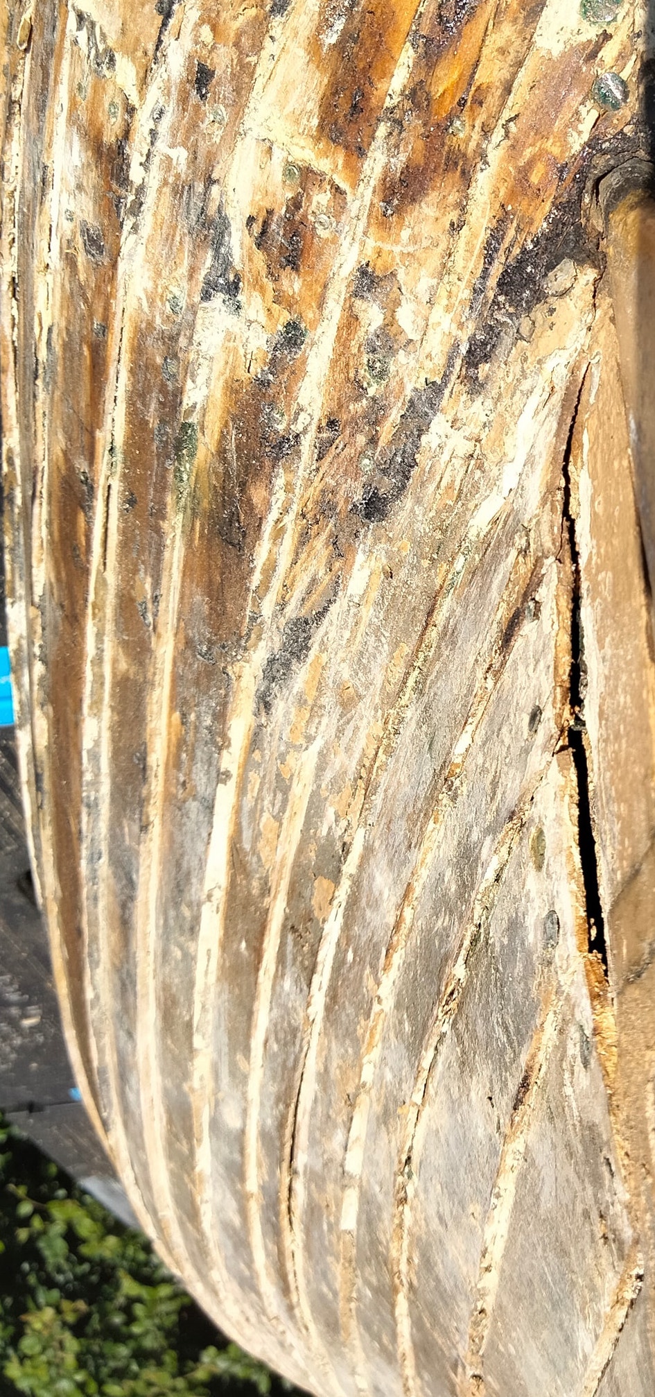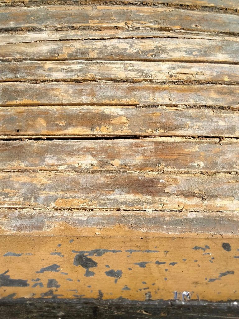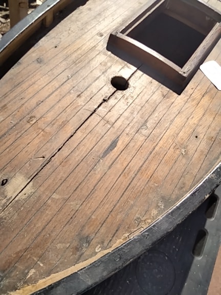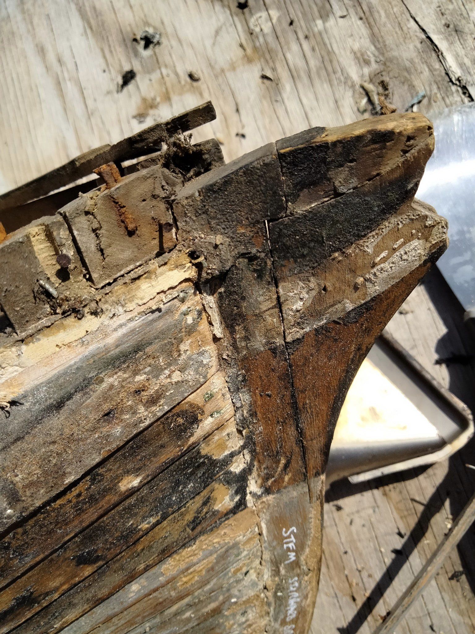 “I have concerns about the deck, too. As you can see, it is badly split forrard, and the view from below confirms my suspicion that it is all of a piece and perhaps thicker than it need be, so replanking might be required. While the fashion piece at thge stern is missing entirely. we must brush up on our carpentry, I think.’